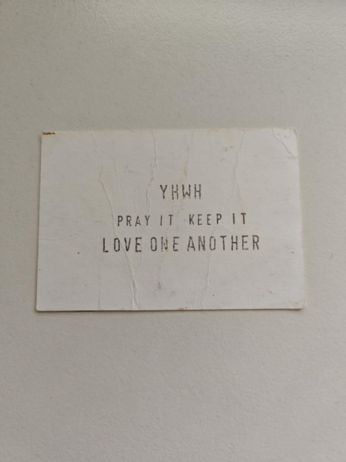 Το κοιτάζω και βλέπω ότι στη μια μεριά έχει τυπωμένο ένα απόσπασμα από το κατά Ιωάννη Ευαγγέλιο και στην άλλη γράφει: “Pray it – Keep it – Love One Another”. Καμία ιδιαίτερη επαφή δεν έχω με τη θρησκεία, ωστόσο θυμάμαι πως εκείνη τη στιγμή που πονούσα και τα έβλεπα όλα μαύρα, το χαρτάκι αυτό με γέμισε ζεστασιά. Ίσως ήταν η χειρονομία περισσότερο που με έκανε να νιώσω έτσι παρά το καθαυτό μήνυμα, δηλαδή και ένα ξερό φύλλο να μου έδινε για εμένα θα ήταν ένα μήνυμα ότι “σε βλέπω, έχε πίστη, όλα θα πάνε καλά”. Εννοείται πως το χαρτάκι το έχω στο πορτοφόλι μου, σαν γούρι, από τότε». – Έλενα Μπούλια.