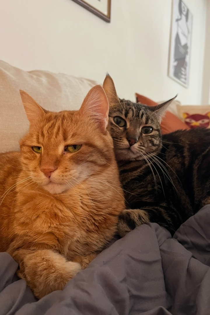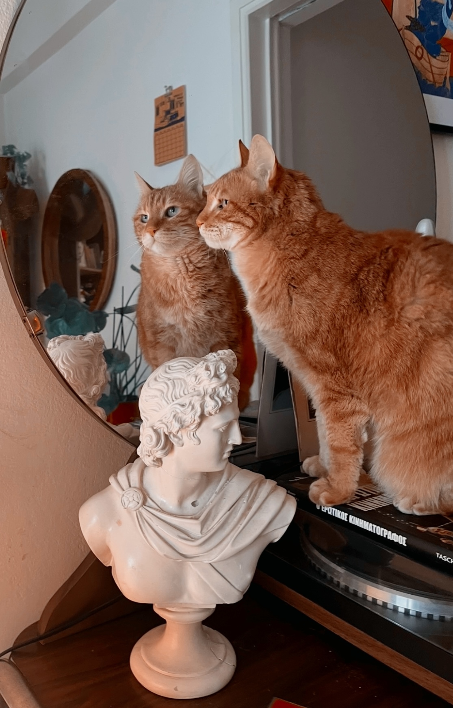 Μεγαλώναμε μαζί και ήταν εκεί σε κάθε κεφάλαιο της ζωής μου: καινούριες δουλειές, σχέσεις, συγκατοικήσεις, χωρισμοί. Έχει γνωρίσει όλους τους ανθρώπους που αγάπησα και αγαπήθηκε εξίσου. 5 περίπου χρόνια αργότερα ήρθε να συμπληρώσει αυτό το μικρό σύμπαν η Ρούμι. Επέζησε από τις πλημμύρες στη Θεσσαλία, ανάμεσα σε άλλα ζωάκια που χρειάζονταν βοήθεια. Την έφερε η συγκάτοικος μου σπίτι. Πάντα ήθελα μια κατάμαυρη γάτα, αλλά να που βρέθηκα με έναν μικρό γκρι “τίγρη” που λατρεύει να κυνηγάει μύγες και να γλείφει τον Χανκ από το πρωί μέχρι το βράδυ».