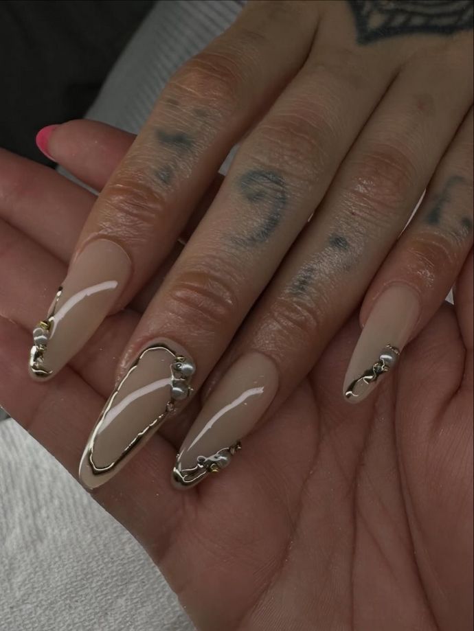 Αν υπήρχε ένα μανικιούρ που να ισορροπούσε ανάμεσα στον μαξιμαλισμό και μινιμαλισμό, αυτό θα ήταν το μανικιούρ της Kehlani. Πάνω σε nude βάση, η celebrity nail artist Johana Castillo, aka MasterWeenay, άπλωσε μία χρυσή απόχρωση και μικροσκοπικές πέρλες που δημιουργούσαν ένα 3D αποτέλεσμα