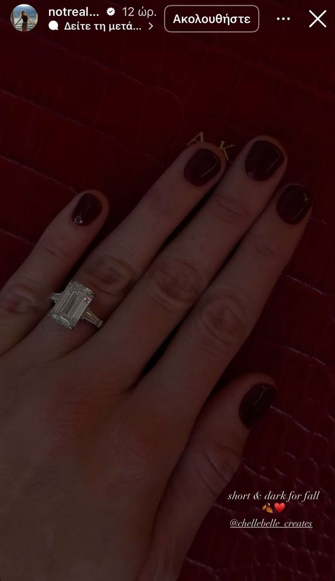 Η ίδια, πριν λίγες μέρες, μοιράστηκε μέσα από τα stories στον προσωπικό λογαριασμό της στο Instagram ένα close-up των χεριών της με τη σκούρα βουργουνδί απόχρωση στο μανικιούρ της να μονοπωλεί το ενδιαφέρον.