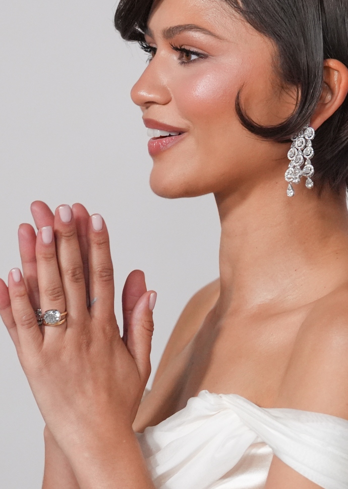 Στην πιο πρόσφατη εμφάνισή της με ένα ιβουάρ φόρεμα Vivienne Westwood, εκτός του φανταστικού beauty look της παρατηρήσαμε και το διακριτικό μανικιούρ που επέλεξε. Τα κοντά και περιποιημένα νύχια της Zendaya ήταν βαμμένα με ένα λευκό βερνίκι νυχιών το οποίο συνδυάστηκε με τη βέρα και το δαχτυλίδι αρραβώνα της, ένα εντυπωσιακό δαχτυλίδι 5 καρατίων της σχεδιάστριας Jessica McCormack.