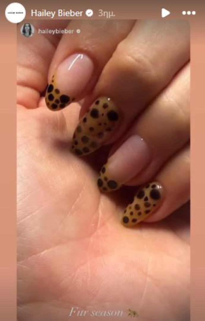Όσο πρωταγωνιστούν τα animal prints στο street style και στις πασαρέλες, άλλο τόσο τα βλέπουμε πάνω σε εντυπωσιακά μανικιούρ που αναδεικνύουν αυτό το ιδιαίτερο print. Η γήινη πλευρά του λεοπάρ, για παράδειγμα, είναι τόσο διαχρονική όσο το να βάψεις τα νύχια σου με ένα καφέ βερνίκι νυχιών. Κάτι αντίστοιχο βλέπουμε και στο παρακάτω μανικιούρ που δοκίμασε η Hailey Bieber.