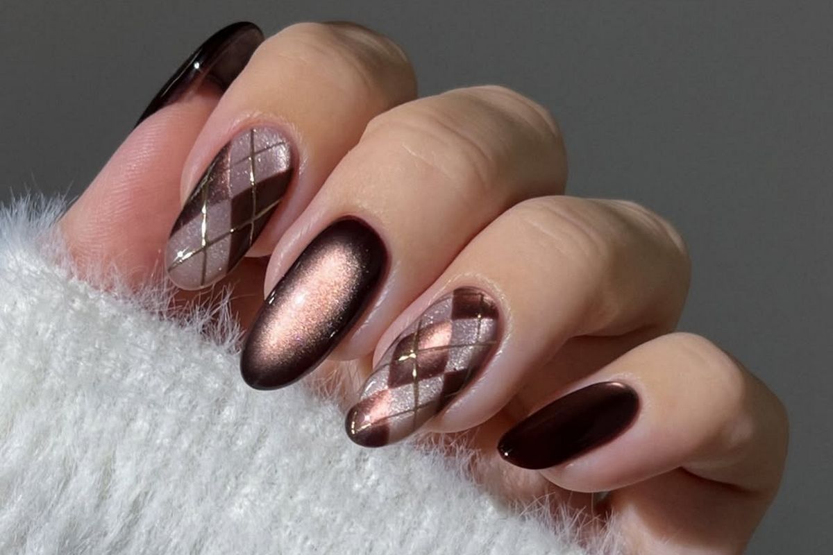 Συνδυάζοντας το κλασικό argyle μοτίβο με μία ζεστή καφέ απόχρωση, αυτό το μανικιούρ δημιουργεί ένα κομψό, cozy και ιδιαίτερα stylish αποτέλεσμα.
