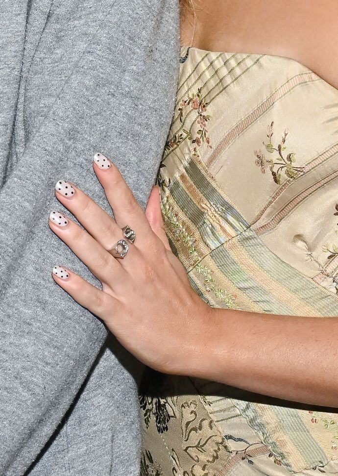 Πάνω σ’ αυτή τη διακριτική βάση, η Sabrina Carpenter πρόσθεσε μικρά μαύρα dots, το χαρακτηριστικό μοτίβο του polka-dot nail art. Η αντίθεση λευκού–μαύρου δημιουργεί ένα retro αποτέλεσμα, που φαίνεται υπέροχο τόσο σε κοντά όσο και σε μακριά νύχια.