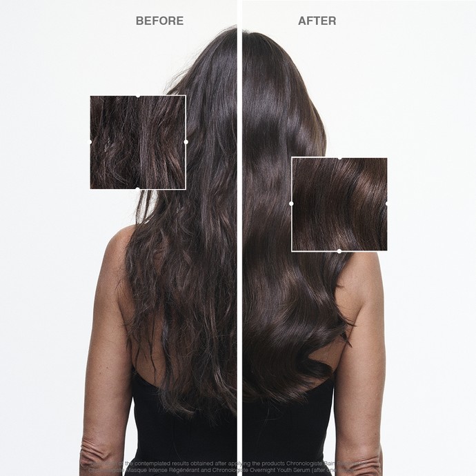 Εντατική θρέψη και περιποίηση με τη Chronologiste Masque Intense Régénérant, που αποκαθιστά τη δύναμη, την ελαστικότητα και την πυκνότητα. Με πλούσια και ενυδατική υφή, θρέφει τα μαλλιά με απαραίτητα λιπίδια και θαλάσσια εκχυλίσματα, προσφέροντας ενδυνάμωση, ενυδάτωση και προστασία. Τα μαλλιά είναι ορατά πιο λεία και ελαστικά ενώ παράλληλα, έχουν περισσότερη δύναμη, λάμψη και αντοχή.