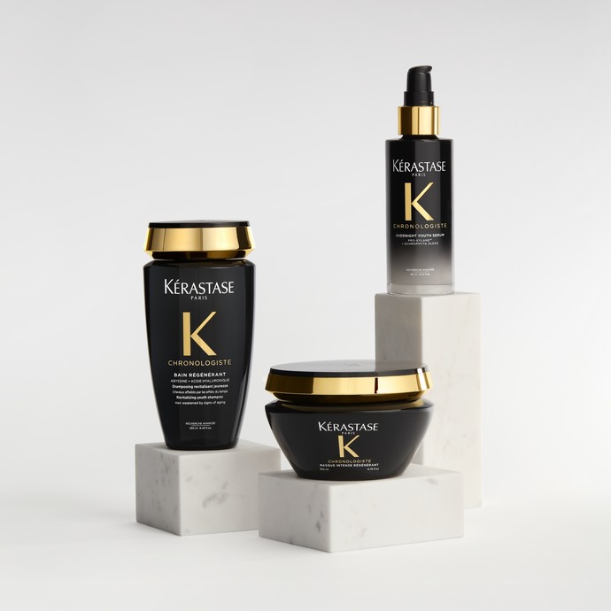 Η ανανεωμένη και πολυτελής σειρά Chronologiste της Kérastase αποτελεί την πιο ολοκληρωμένη έκφραση αυτής της φιλοσοφίας. Σχεδιασμένη για μαλλιά που έχουν αποδυναμωθεί από τα σημάδια του χρόνου, στοχεύει τόσο τα ορατά όσο και τα αόρατα αίτια της γήρανσης. Η δράση της επικεντρώνεται αφενός στην αντιμετώπιση των 5 ορατών σημαδιών γήρανσης (τη θαμπάδα, την ξηρότητα, το φριζάρισμα, την έλλειψη όγκου & την έλλειψη πυκνότητας τη θαμπάδα, την ξηρότητα, το φριζάρισμα, την έλλειψη όγκου & την έλλειψη πυκνότητας) αφετέρου, στην ενίσχυση της κυτταρικής δραστηριότητας στις ρίζες και στο τριχωτό, στοχεύοντας τα αόρατα αίτια που υποβαθμίζουν τη δύναμη, την αντοχή και τη λάμψη των μαλλιών.