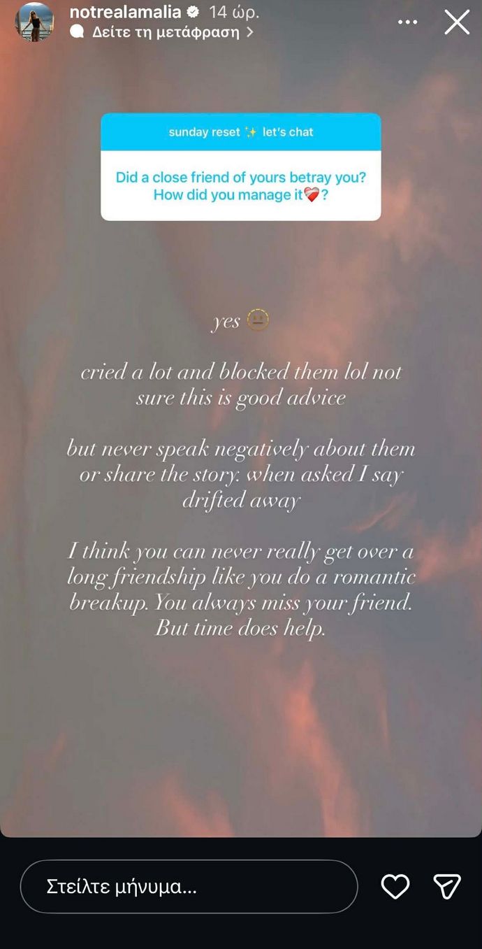 Πέρα από τη σχέση της και τη γνωριμία με τον Jake Medwell, η Αμαλία Κωστοπούλου μίλησε και για τις φιλίες της όπου μια από εκείνες, την απογοήτευσε και την έκανε να ξεσπάσει σε κλάματα. Μάλιστα, ανέφερε πως πάντα θα της λείπει και ότι ο χρόνος «γιατρεύει» πάντα τις πληγές. Έπειτα, αναφέρθηκε και στη μητέρα της, Τζένη Μπαλατσινού η οποία της έχει δώσει τις καλύτερες συμβουλές για να αντιμετωπίζει διαφορετικά τη ζωή. Μια από αυτές που έχει πει στην Αμαλία Κωστοπούλου είναι να βασίζεται μόνο στον εαυτό της και σε κανέναν άλλον.