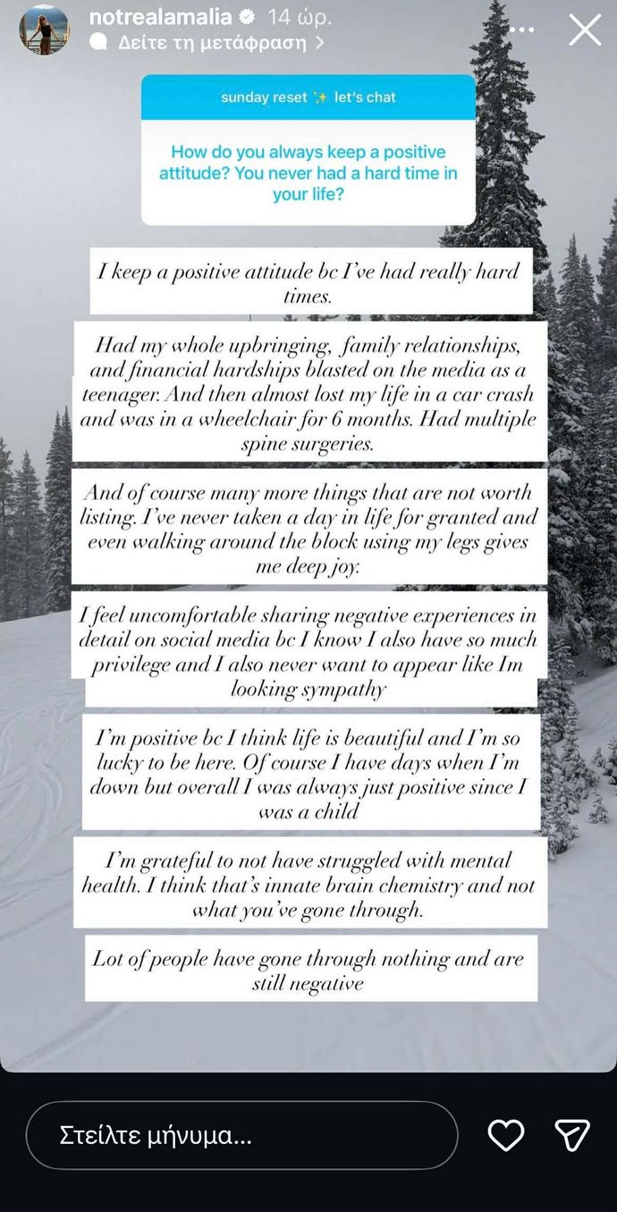 Και φυσικά πολλά ακόμη πράγματα που δεν αξίζει να απαριθμήσω. Δεν έχω θεωρήσει ποτέ ούτε μία μέρα στη ζωή μου δεδομένη και ακόμη και μια απλή βόλτα στο τετράγωνο με τα πόδια μου μου δίνει βαθιά χαρά. Νιώθω άβολα να μοιράζομαι αρνητικές εμπειρίες με λεπτομέρειες στα social media, γιατί ξέρω ότι έχω επίσης πολλά προνόμια και δεν θέλω ποτέ να φανεί ότι ζητάω συμπόνια. Είμαι θετική γιατί πιστεύω ότι η ζωή είναι όμορφη και νιώθω τόσο τυχερή που βρίσκομαι εδώ. Φυσικά υπάρχουν μέρες που πέφτω ψυχολογικά, αλλά γενικά ήμουν πάντα θετική από τότε που ήμουν παιδί. Είμαι ευγνώμων που δεν έχω αντιμετωπίσει δυσκολίες με την ψυχική μου υγεία».