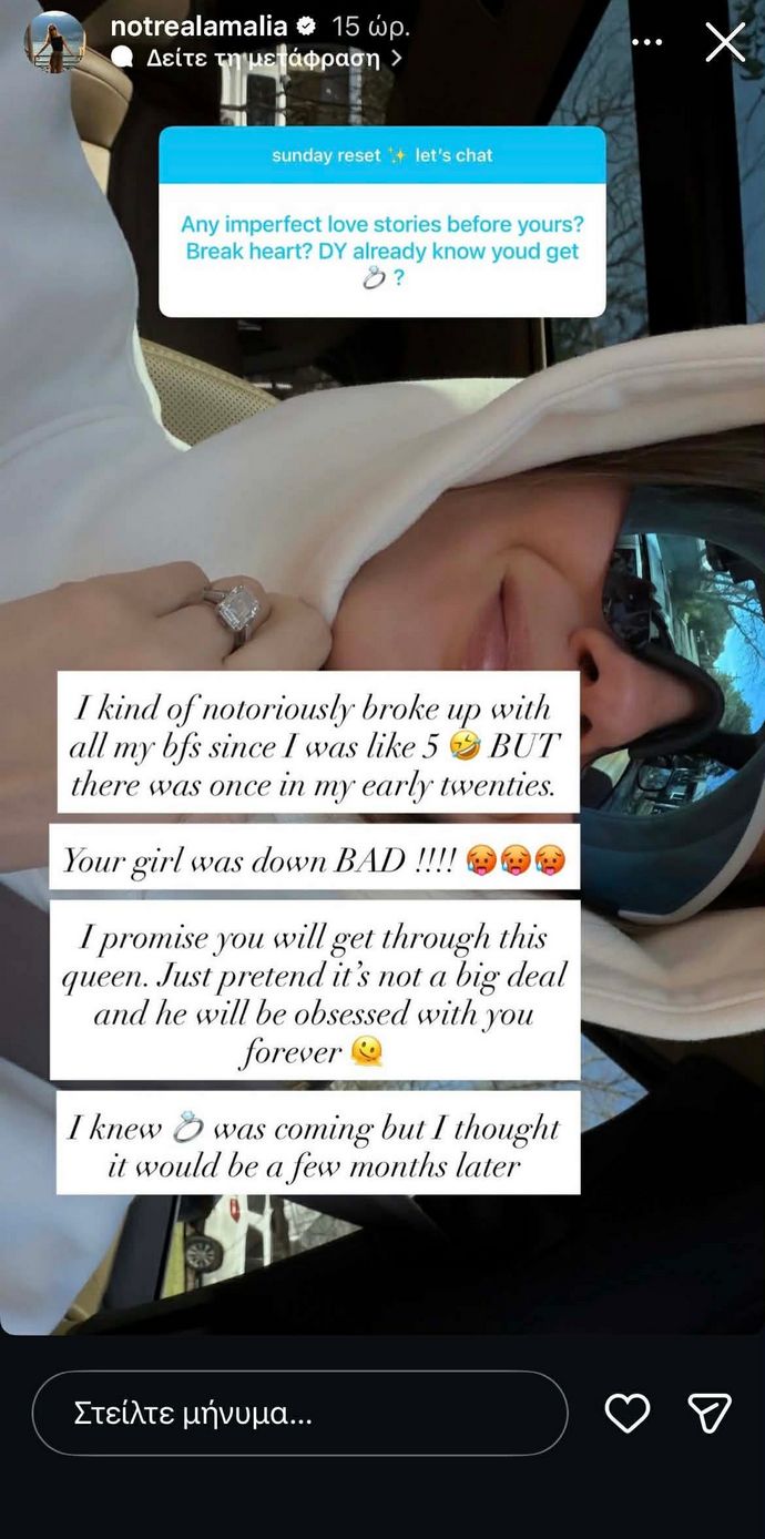 Η Αμαλία Κωστοπούλου πραγματοποίησε ένα Q & A το σαββατοκύριακο 21-22 Φεβρουαρίου μέσα από τον προσωπικό της λογαριασμό στο Instagram, όπου μερικοί followers της, τη ρωτούσαν για τη γνωριμία με τον σύζυγό της, Jake Medwell αλλά και τι χαρακτηριστικά έχει που τον έχουν κάνει ξεχωριστό στην καρδιά της. Όπως θα δεις μέσα από τα παρακάτω stories, η κόρη της Τζένης Μπαλατσινού και του Πέτρου Κωστόπουλου, μιλά με πολύ τρυφερά λόγια για εκείνον με τον οποίο είναι μαζί από τον Ιούνιο του 2023.