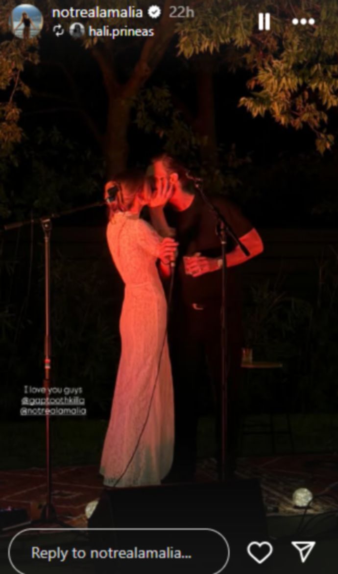 Ανάμεσα στα στιγμιότυπα, θα δεις και το τρυφερό φιλί που αντάλλαξε το ζευγάρι κατά τη διάρκεια του πάρτι. Η Αμαλία Κωστοπούλου επέλεξε για εκείνη τη βραδιά να φορέσει ένα μακρύ, δαντελένιο φόρεμα συνδυάζοντάς το με μαύρες, καουμπόικες μπότες.