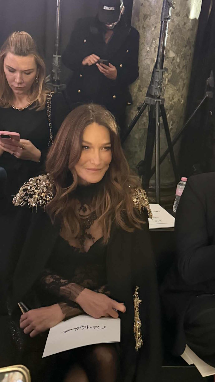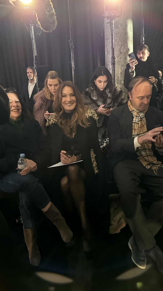 Η πρώην Πρώτη Κυρία της Γαλλίας, Carla Bruni εντυπωσίασε με την παρουσία της πριν την έναρξη του show, φορώντας δημιουργίες της σχεδιάστριας. Ο φακός του LadyLike την κατέγραψε να ετοιμάζεται να παρακολουθήσει το show φορώντας ένα μαύρο φόρεμα με διακριτικές δαντελένιες λεπτομέρειες, το οποίο συνδύασε με ψηλοτάκουνες γόβες και μια εντυπωσιακή κάπα.