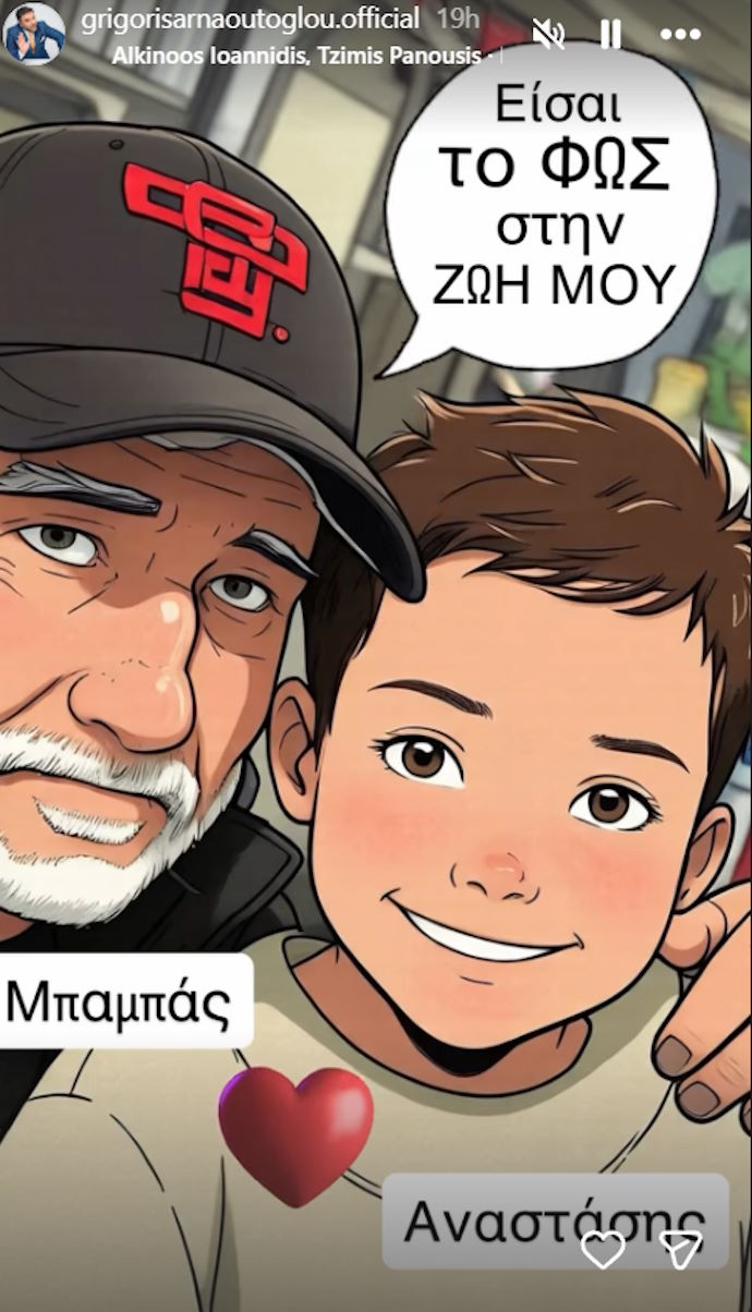 Ο Γρηγόρης Αρναούτογλου το βράδυ της Τετάρτης 3 Δεκεμβρίου πραγματοποίησε μια διαφορετική ανάρτηση στον προσωπικό του λογαριασμό στο Instagram και συγκεκριμένα, ανέβασε μια επεξεργασμένη φωτογραφία, ώστε να έχει τη μορφή κόμικ, μαζί με τον 13χρονο γιο του, Αναστάση που απέκτησε με την πρώην σύντροφό του, Κατερίνα Κόκλα. Ο παρουσιαστής έχει εκφράσει αρκετές φορές μέσα από την εκπομπή του, The 2night Show, αλλά και μέσα από τηλεοπτικές δηλώσεις του, ότι έχει αδυναμία στον γιο του και προσπαθεί να είναι δίπλα του.
