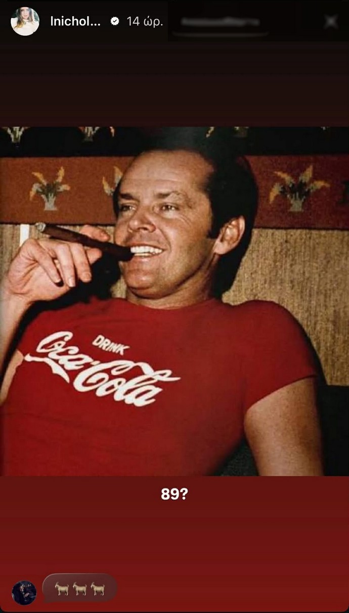 Η Lorraine, η οποία συμπλήρωσε τα 36 της χρόνια στις 16 Απριλίου, συμπεριέλαβε στη δημοσίευση της 22ης Απριλίου, ημέρα γενεθλίων του πατέρα της, και μια παλαιότερη φωτογραφία του Jack Nicholson, στην οποία εμφανίζεται να καπνίζει πούρο, συνοδεύοντάς τη λιτά με τη λεζάντα «89;». Σε μια 2η εικόνα, ο ηθοποιός φαίνεται να χαμογελά και να χειροκροτεί, ενώ στο φόντο διακρίνεται και η Joni Mitchell να χειροκροτεί επίσης. Αυτή τη φορά, η Lorraine συνόδευσε τη φωτογραφία με τη λεζάντα «89!!»
