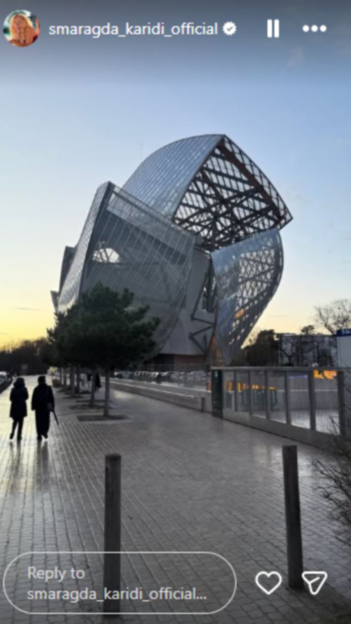 Η Σμαράγδα Καρύδη δημοσίευσε στον προσωπικό της λογαριασμό στο Instagram μια σειρά από φωτογραφίες όπου βλέπουμε τα μέρη που επισκέφθηκε όπως το Ίδρυμα Louis Vuitton, το Crazy Horse αλλά και γαλλικά εστιατόρια. Η ηθοποιός ανέβασε και μια φωτογραφία όπου ποζάρει στον καθρέφτη φορώντας τη γούνα της και έτοιμη να περιπλανηθεί στη γαλλική πρωτεύουσα.