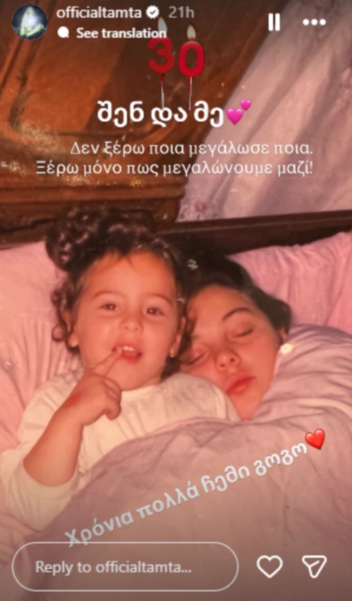 Η τραγουδίστρια δημοσίευσε στον προσωπικό της λογαριασμό στο Instagram, μια φωτογραφία από το παρελθόν όπου είναι αγκαλιά με την κόρη της. «Δεν ξέρω ποια μεγάλωσε ποια. Ξέρω μόνο πως μεγαλώνουμε μαζί. Χρόνια πολλά» ήταν τα λόγια της Τάμτα στην κόρη της.