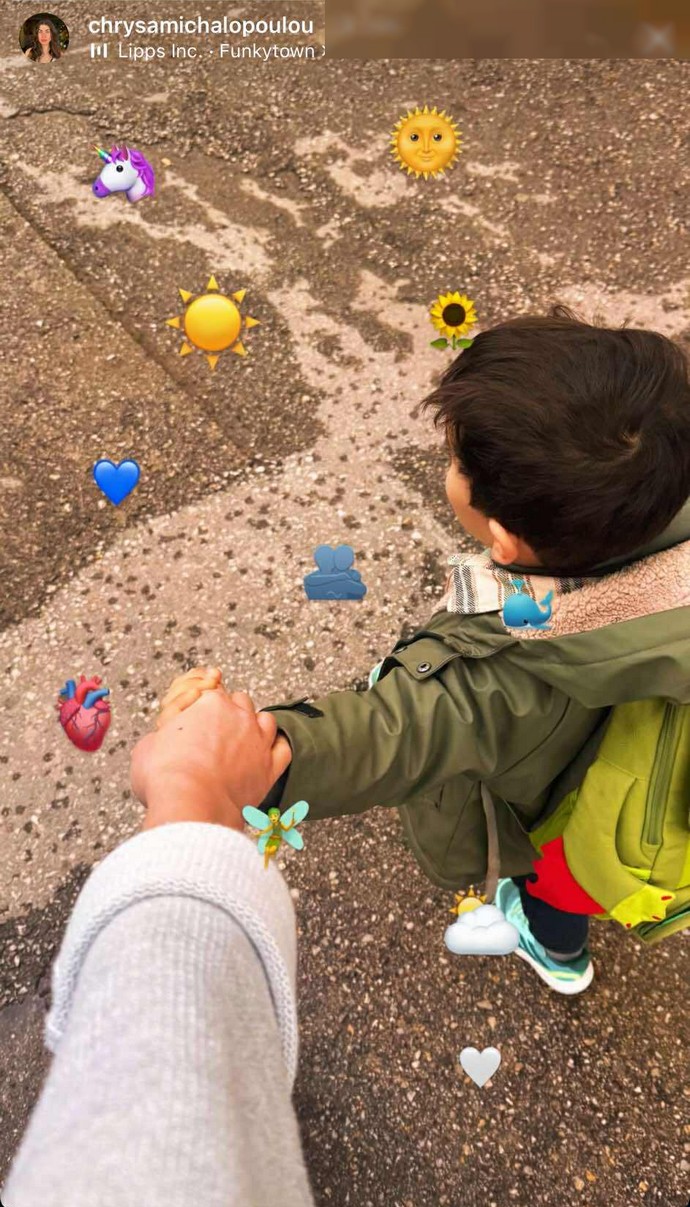 Αυτή τη φορά η Χρύσα Μιχαλοπούλου ανάρτησε μια φωτογραφία μέσα από story στο Instagram, όπου τη βλέπουμε να κρατάει το χέρι του μικρού Κίμωνα, ενώ εκείνος βλέπουμε να φοράει) μια λαχανί σχολική τσάντα. Η λήψη έχει μια ακόμα πιο παιχνιδιάρικη αίσθηση, λόγω των emoji που έχει προσθέσει η ηθοποιός.