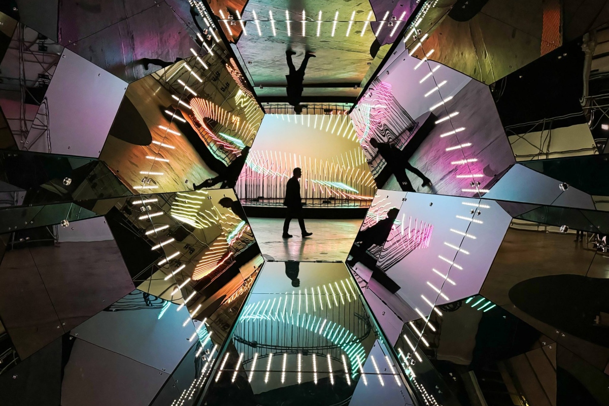 Στο έργο Passengers των Guillaume Marmin/ Tetro, θα περπατάς μέσα σε μία «κάψουλα» όπου ο χώρος, αλλά κι εσύ πολλαπλασιάζεσαι μέσα από αντανακλάσεις. Ένα ψηφιακό τοπίο που αλλάζει και μεταμορφώνεται κάθε στιγμή.
