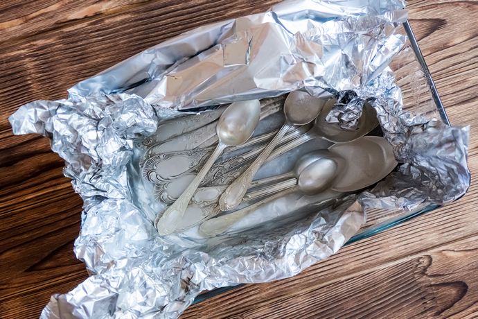 Είτε έχεις αγοράσει κάποια καινούρια ασημένια αντικείμενα είτε σκοπεύεις να καθαρίσεις τα παλιά πιάτα και πιρούνια, το αλουμινόχαρτο μπορεί να είναι το μόνο που χρειάζεσαι για να αποκτήσουν ξανά τη λάμψη τους. Στρώσε σε ένα μικρό δοχείο με κάποιο αλουμινόχαρτο, πρόσθεσε βραστό ζεστό νερό και μερικές κουταλιές της σούπας αλάτι ή μαγειρική σόδα και τοποθέτησε μέσα τα ασήμι σκεύη, κοσμήματα και οτιδήποτε άλλο.