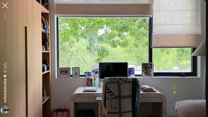 Το γραφείο της Αμαλίας Κωστοπούλου έχει θέα ένα καταπράσινο μέρος που κατευθείαν παραπέμπει στην άνοιξη. Επειδή έχει μεγάλα παράθυρα, μπαίνει άπλετο φυσικό φως με αποτέλεσμα το δωμάτιο να δείχνει μεγαλύτερο.