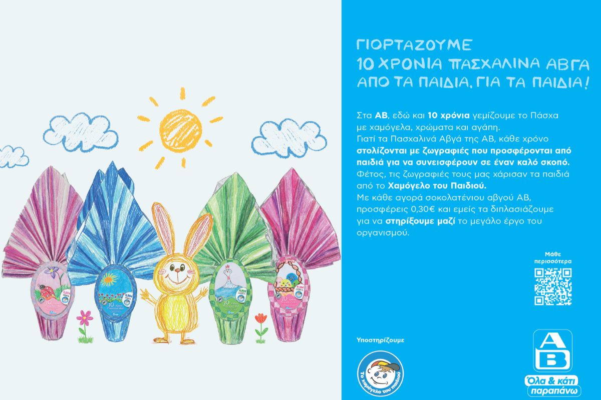 Συμπληρώνοντας 10 χρόνια της ενέργειας Πασχαλινών Αβγών, η ΑΒ Βασιλόπουλος ετοιμάζει για τα παιδιά των πελατών της την πιο ωραία έκπληξη, καλώντας τα να συμμετέχουν ενεργά στη δράση προσφοράς προς άλλα παιδιά εκεί έξω. Στο έγραψα και παραπάνω αυτό που κάνει τα Πασχαλινά Αβγά της ΑΒ πραγματικά ξεχωριστά είναι ότι σχεδιάζονται από παιδιά για παιδιά.