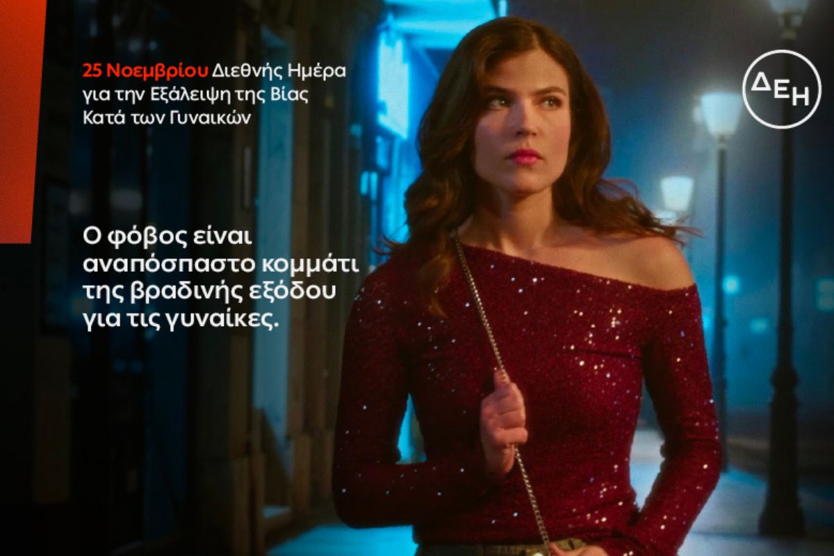 Για πέμπτη συνεχή χρονιά η ΔΕΗ συμμετέχει ενεργά στη Διεθνή Ημέρα για την Εξάλειψη της Έμφυλης Βίας, φωτίζοντας μια καθημερινή και βαθιά ριζωμένη εμπειρία ανασφάλειας, τον φόβο που βιώνουν γυναίκες όλων των ηλικιών κατά τη βραδινή τους έξοδο. Η νέα πανελλαδική έρευνα επιβεβαιώνει ότι για 8 στις 10 γυναίκες η επιστροφή από μια βραδινή έξοδο δεν αποτελεί μια απλή διαδρομή, αλλά μια διαδικασία που συνοδεύεται από φόβο, επιφύλαξη και συστηματικά μέτρα αυτοπροστασίας.