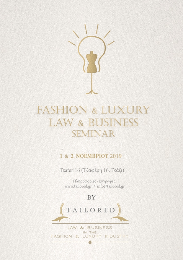 Στις 1 & 2 Νοεμβρίου 2019 στον πολυχώρο TZAFERI 16 (Τζαφέρη 16, Γκάζι), στο πλαίσιο του εξειδικευμένου εκπαιδευτικού σεμιναρίου “FASHION & LUXURY LAW & BUSINESS” by Tailored, θα συγκεντρωθούν: σχεδιαστές, έμποροι, επιχειρηματίες, δικηγόροι, managers, influencers, φωτογράφοι, e-shops, marketing specialists, business strategists, e-business consultants, you-tubers, event planners, εκδότες ηλεκτρονικών και έντυπων περιοδικών για να ακούσουν διακεκριμένους Έλληνες και ξένους ομιλητές να μιλούν για: