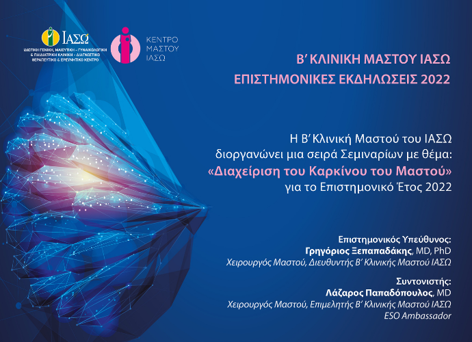 Η Β’ Κλινική Μαστού του ΙΑΣΩ διοργανώνει μια σειρά Επιστημονικών Εκδηλώσεων με θέμα “Διαχείριση του Καρκίνου του Μαστού” για το Επιστημονικό Έτος 2022, στις οποίες θα συμμετέχουν προσκεκλημένοι ομιλητές από όλο τον κόσμο.