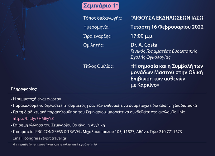 Το 1ο Σεμινάριο με θέμα: “Η σημασία και η συμβολή των μονάδων Μαστού στην Ολική Επιβίωση των ασθενών με Καρκίνο”, θα πραγματοποιηθεί την Τετάρτη 16 Φεβρουαρίου 2022, ώρα 17:00, στην Αίθουσα Εκδηλώσεων της Κλινικής ΙΑΣΩ (Λεωφ. Κηφισίας 37-39, Μαρούσι). Ομιλητής θα είναι ο κ. Dr. A. Costa, Γενικός Γραμματέας Ευρωπαϊκής Σχολής Ογκολογίας.