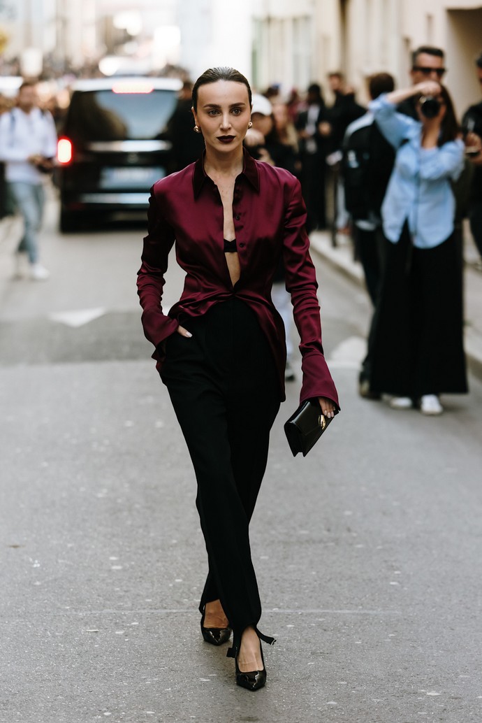Το «γυαλιστερό» σατέν είναι το ιδανικό ύφασμα για τις εμφανίσεις σου στις γιορτές. Ένα σατέν πουκάμισο φοριέται με φούστες, παντελόνια, ανοιχτό σε layers. Αν επιλέξεις το σατέν σε μια αισθησιακή απόχρωση όπως το βουργουνδί, τότε αυτό θα ταιριάξει τέλεια με ένα μαύρο παντελόνι.