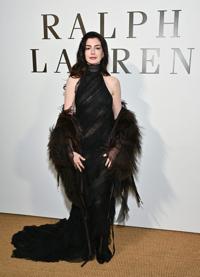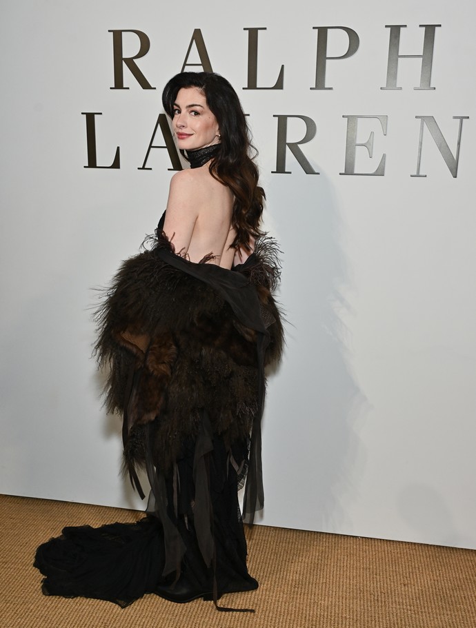 Η Anne Hathaway φαίνεται να «εκμεταλλεύτηκε» το concept αυτό επιλέγοντας μια δημιουργία του Lauren από τη Fall 2025 συλλογή του οίκου για την εμφάνισή της: ένα μαύρο ημιδιάφανο φόρεμα με ψηλό γιακά και άνοιγμα στην πλάτη που έφτανε χαμηλά μέχρι την ουρά.
