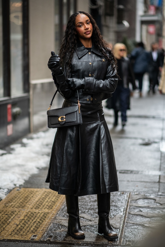 Το leather on leather είναι ένας τρόπος να αναδείξεις ακόμη περισσότερο το δερμάτινο jacket σου. Θα το φορέσεις με μία μίντι full skirt κι ένα ζευγάρι μπότες.