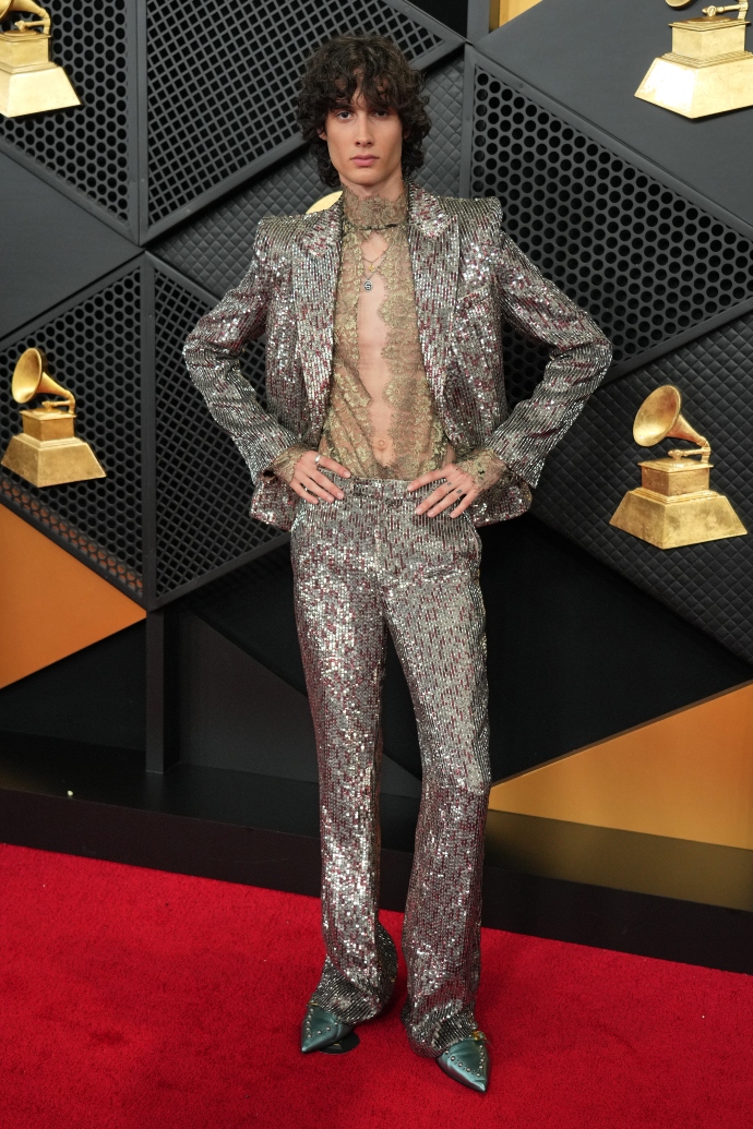Το sparkly κοστούμι του Sombr με σακάκι με έντονους ώμους και μακρύ παντελόνι συνδυάστηκε με ένα δαντελένιο διάφανο πουκάμισο και metallic παπούτσια.