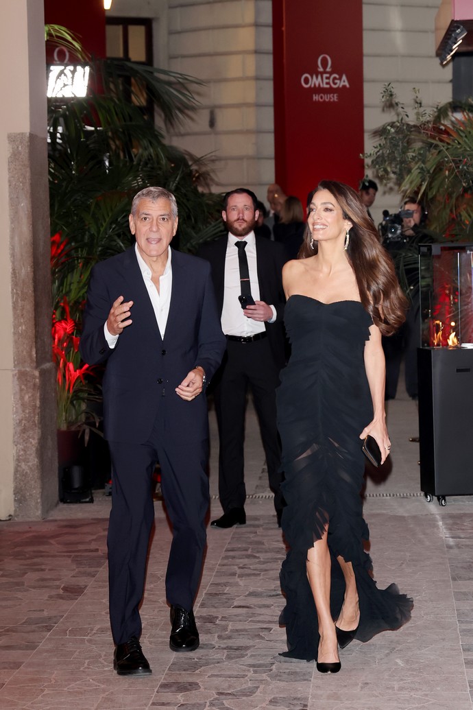 Συνοδευόμενη από τον George Clooney, η Amal φόρεσε ένα μαύρο στράπλες φόρεμα σε μια γραμμή που αγκάλιαζε όμορφα το σώμα της. Το ρούχο είχε επίσημο ύφος λόγω του μήκους του αλλά και του σχεδίου του: ένα φόρεμα με σούρες από ημιδιάφανο σιφόν που άνοιγε στη μέση στο τελείωμα, καταλήγοντας σε μια μικρή ουρά.