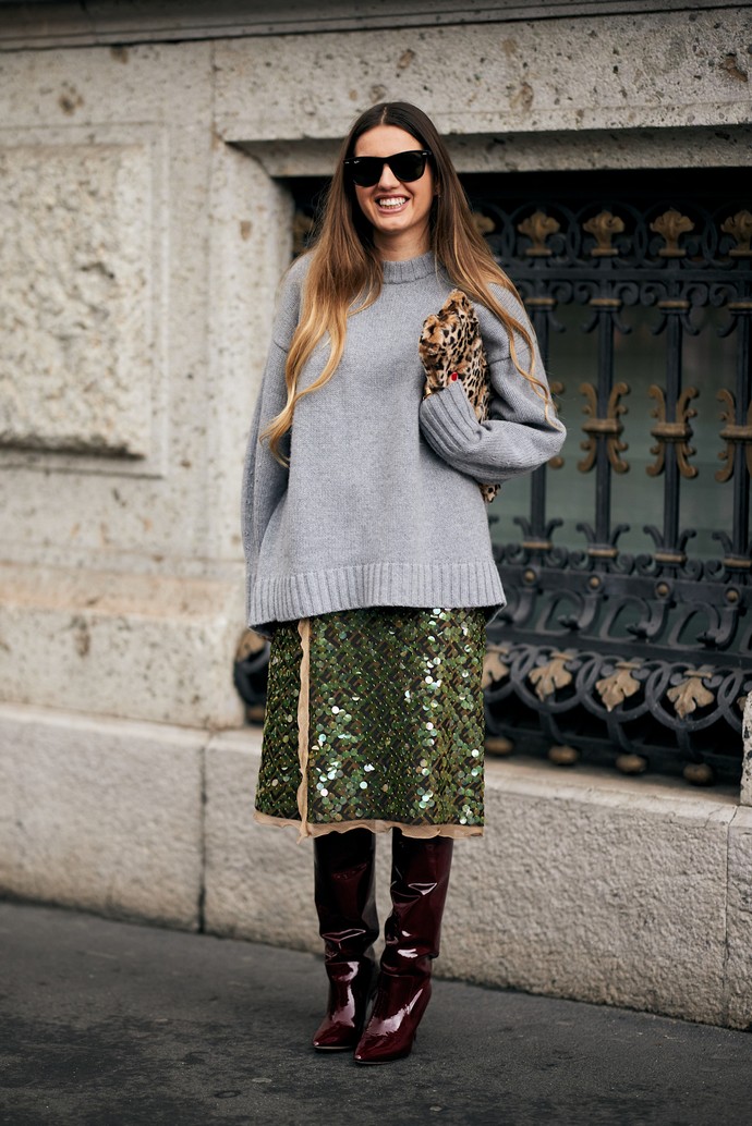 Για το πιο κομψά day-to-night σύνολα, φόρεσε τη φούστα με παγιέτες με πουλόβερ και ψηλές μπότες.
