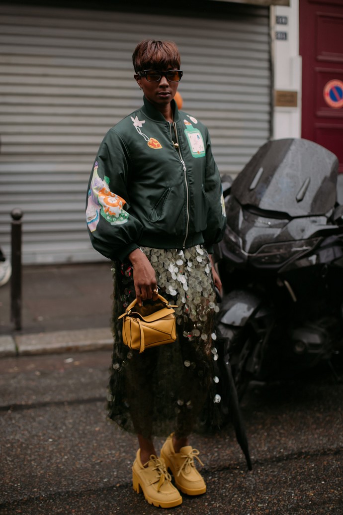 Πρόσφερε ένα αθλητικό twist στη λαμπερή αυτή φούστα, συνδυάζοντάς τη με ένα bomber jacket και μποτάκια.