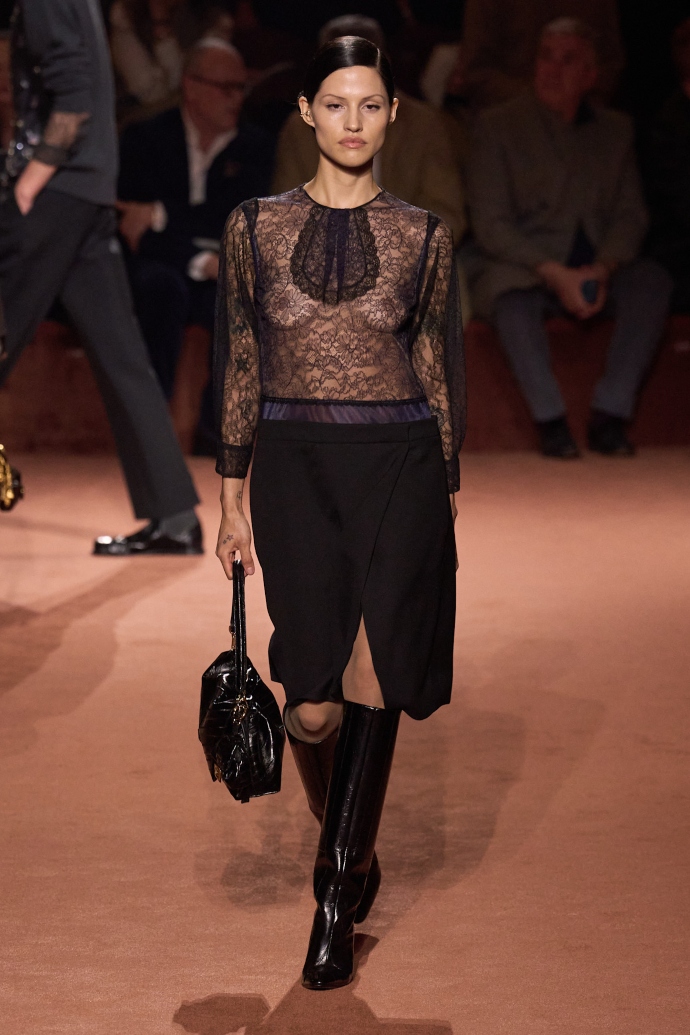 Η Fall 2025 συλλογή του οίκου Fendi πρότεινε τη δαντέλα μέσα από τον all time classic combo με μαύρη φούστα και δαντελένιο πουκάμισο.