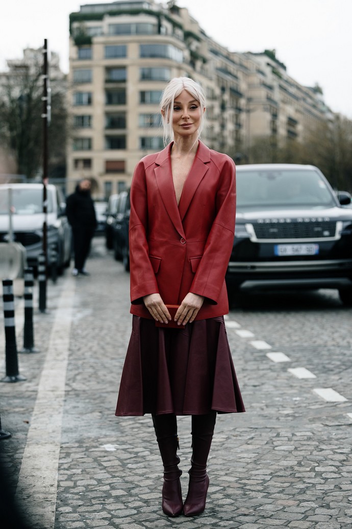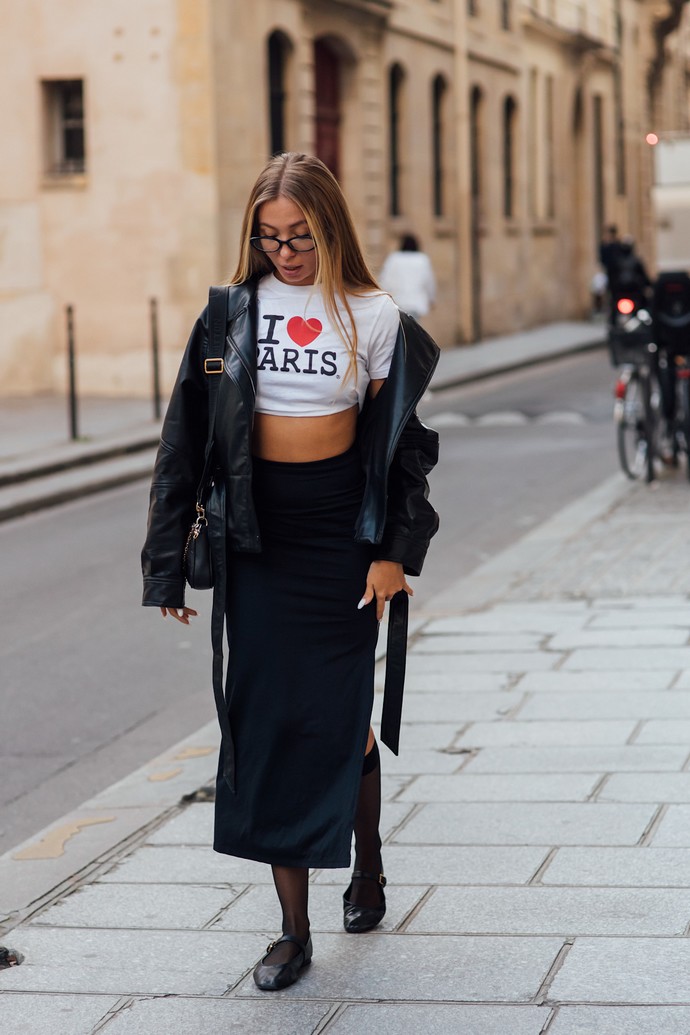 Για ένα πιο streetwear inspired σύνολο, φόρεσε τη midi φούστα με crop top και δερμάτινο jacket.