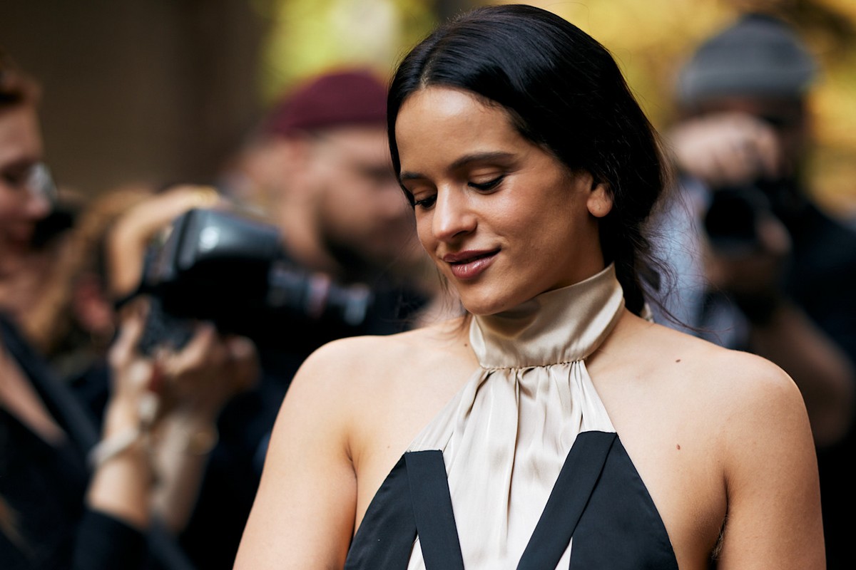 Στα χρώματα του nude pink και του μαύρου, το φόρεμα είναι αισθησιακό αλλά ταυτόχρονα και δυναμικό. Όπως και η Fall 2024 συλλογή της σχεδιάστριας που αντιστέκεται στην πατριαρχία και τις κοινωνίες που έχουν χτιστεί ευνοώντας πάντα τον άνδρα, έτσι και το look της Rosalía δίνει «φωνή» στη γυναίκα μέσω της μόδας, κάτι που κάνει και με τη μουσική της.