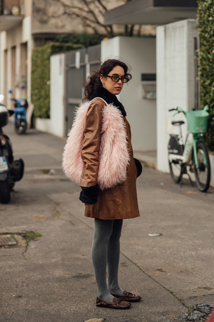 Καλσόν και άλλα fluffy αξεσουάρ σε ένα σύνολο που απογειώνει το ροζ, το γκρι και το καφέ