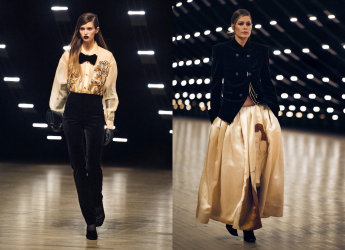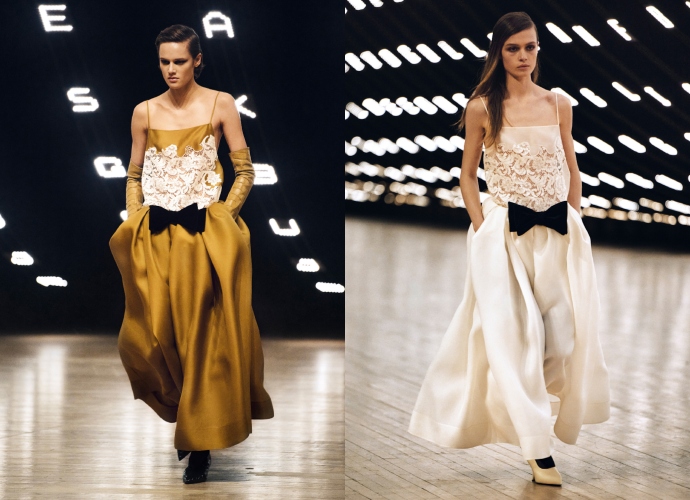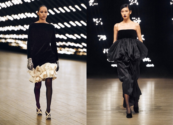 80s αναφορές ήταν ξεκάθαρες στη συλλογή Khaite, με looks όπως τα βελούδινα φορέματα με βολάν και φλοράλ jumpsuits να αποδίδουν την έννοια της παραδοσιακής θηλυκότητας με φρέσκο τρόπο.