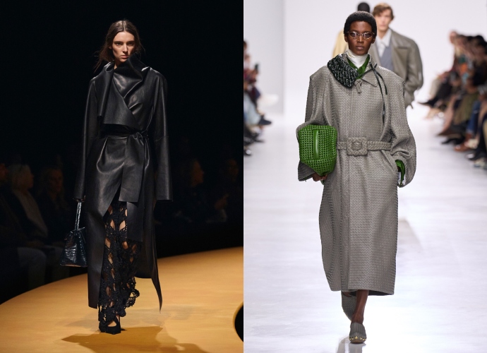 Για παράδειγμα, στις συλλογές των Saint Laurent, Khaite και Bottega Veneta μεταξύ άλλων, βλέπουμε τη δερμάτινη καμπαρντίνα μέσα από πιο ογκώδεις σιλουέτες, πιο έντονα χρώματα αλλά και ενδιαφέρουσες υφές όπως το λουστρίνι, το patent leather, αλλά και το κροκό, που προσφέρουν μια φουτουριστική και σοφιστικέ ταυτόχρονα διάθεση στο ρούχο αυτό.