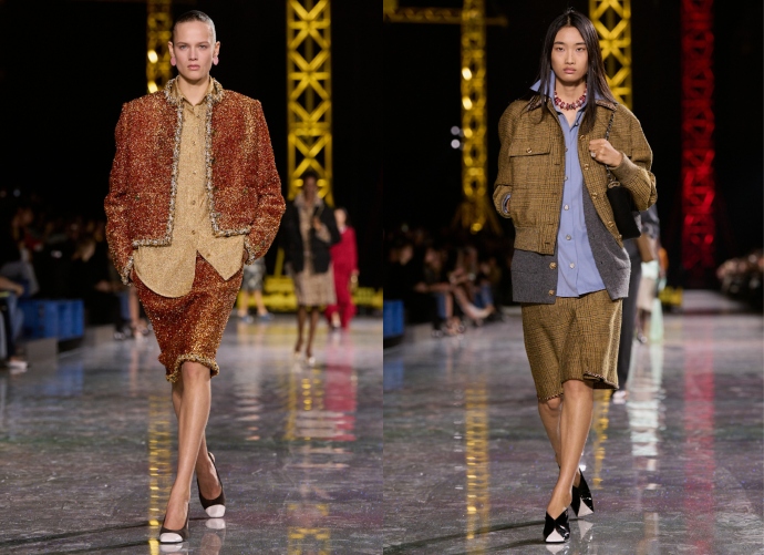 Αυτές οι αντιθέσεις στις οποίες βασίστηκε ο Blazy, διευρύνονται ακόμη περισσότερο μέσα από κομμάτια που δανείζονται στοιχεία από τη workwear γκαρνταρόμπα: πουκάμισα από μπουκλέ tweed ή blousons φορέματα από πιεσμένο tweed δίνουν μια πιο casual αισθητική στο tailoring. Παράλληλα, τα πιο ανάλαφρα και χαλαρά σύνολα από μεταξωτό ζέρσεϊ αποδίδουν μια ελαφρότητα που παραπέμπει στις ντραπέ σιλουέτες του ‘20.