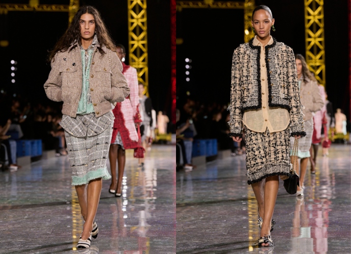 Στο επίκεντρο της συλλογής Chanel, βρίσκεται το εμβληματικό κοστούμι. Ο Blazy το αντιμετωπίζει ως ένα ευέλικτο κομμάτι της γκαρνταρόμπας και το μεταμορφώνει μέσα από τα υλικά αλλά και τις τεχνικές που χρησιμοποιεί, εξελίσσοντάς το κι άλλο. Παραδοσιακά tweed υφάσματα συνδυάζονται με rib πλεκτά, ενώ νέα υφάσματα συνδυάζουν τεχνητές ίνες και lurex με φυσικές γάζες (ένα λεπτό φυσικό ύφασμα).