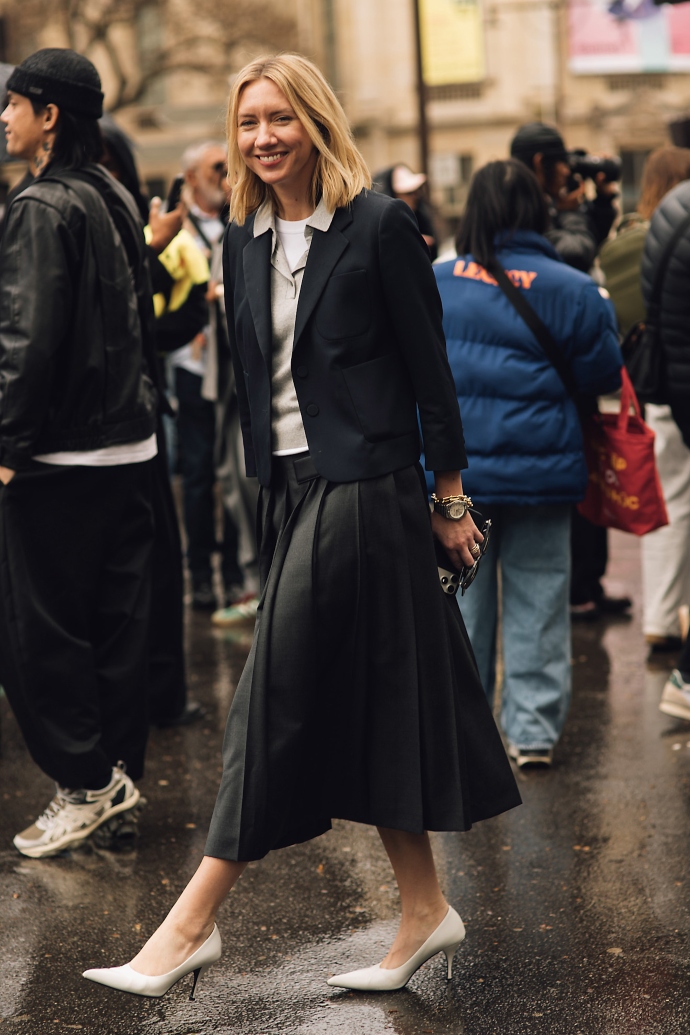 Οι πλισέ φούστες στη Spring 2025 συλλογή του οίκου Prada συνδυάστηκαν με ψηλές ζώνες που τοποθετήθηκαν στη μέση του σώματος ενώ στηρίζονταν με μερικά clips από τη φούστα. Αυτό είναι ένα εξαιρετικό τρικ αν θέλεις να δώσεις μια νέα πνοή στον τρόπο που τη φοράς. Το υπόλοιπο styling μπορεί να ολοκληρωθεί με μερικές απλές προσθήκες.