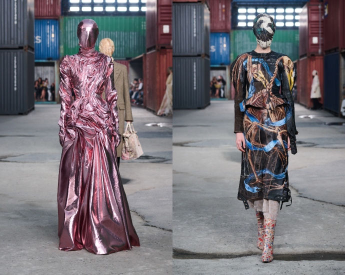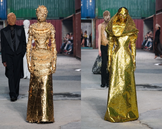 Το χρυσό κυριάρχησε και στα ρούχα της συλλογής, όχι όμως ως ένα χρώμα που συμβολίζει την πολυτέλεια αλλά ως ένα μέσο αφήγησης: άλλοτε μέσα από «πατιναρισμένα» σύνολα που έμοιαζαν φθαρμένα και άλλοτε σε μακριά, εντυπωσιακά φορέματα που έμοιαζαν σαν να «λιώνουν», υπονομεύοντας την ίδια την έννοια της πολυτέλειας.