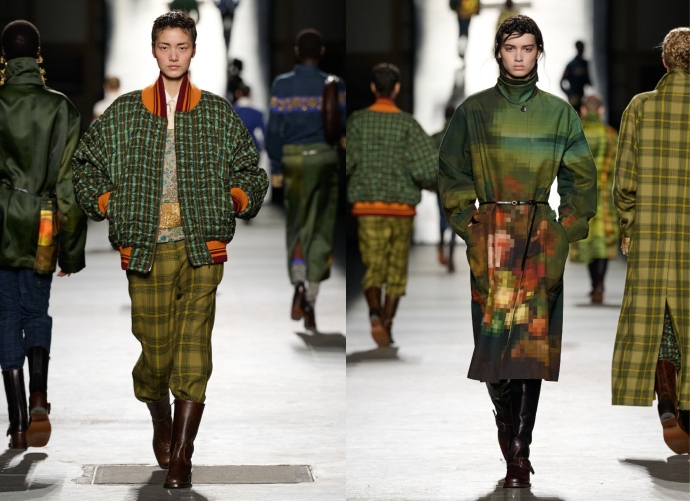 Ακόμη, σε αυτή τη συλλογή Dries Van Noten, ο Klausner έδειξε επίσης μια ιδιαίτερη αγάπη για τις λεπτομέρειες. Ελαστικοί γιακάδες που βλέπεις σε baseball jackets, εμφανίστηκαν σε «αυστηρά» παλτό, ενώ το μπροκάρ ενσωματώθηκε σε ρούχα με πιο χρηστικό χαρακτήρα. Πολύχρωμα πλεκτά με ιδιαίτερα μοτίβα έφεραν μια αίσθηση οικειότητας, ενώ τα pixelated prints -μια μεταφορά για την εξέλιξη και την ανάπτυξη-, προσέθεσαν μια σύγχρονη διάσταση στη συλλογή.