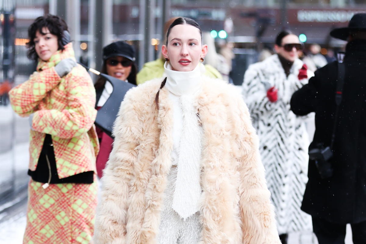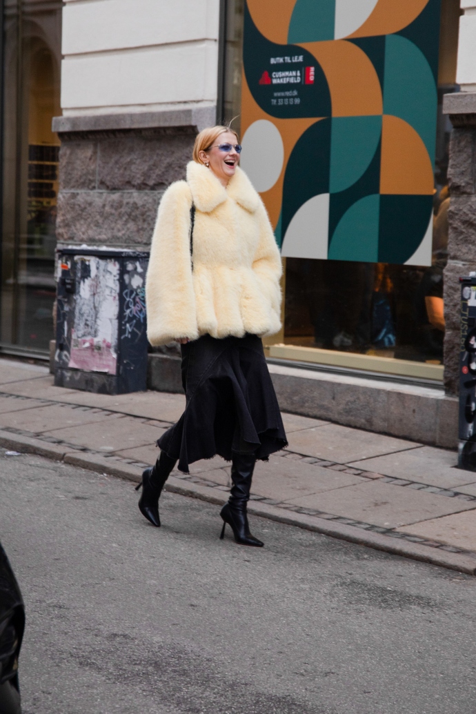 Τα faux γούνινα πανωφόρια είχαν φυσικά τον πρωταγωνιστικό ρόλο στο street style της Κοπεγχάγης. Σε ανοιχτές αποχρώσεις όπως αυτή του λευκού και των παστέλ φορέθηκαν πάνω από τζιν παντελόνια και δερμάτινες φούστες.
