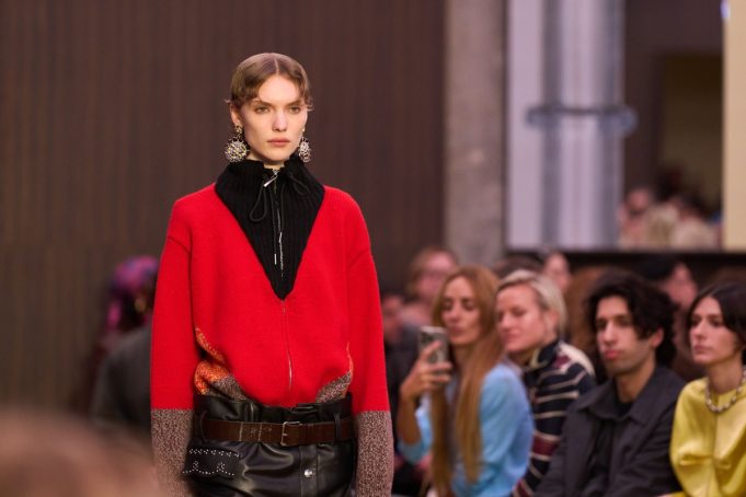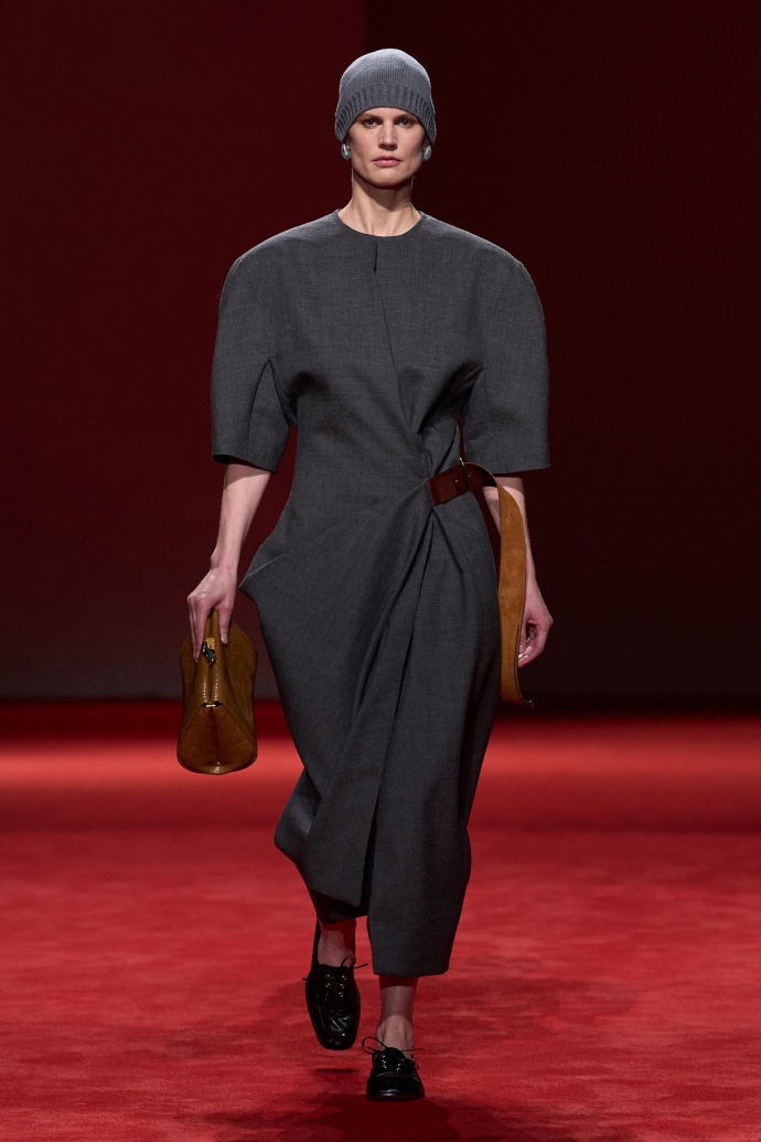 Στη συνέχεια, η χρήση του ανακυκλωμένου υολαμβάμβακα έγινε και πάλι επιτυχημένα πάνω σε φορέματα (χαρακτηριστικό παράδειγμα το κατακόκκινο φόρεμα που θα δεις παρακάτω ή το sparkly μπορντό σετ). Τα ρούχα ήταν πραγματικά εκπληκτικά και ήταν μια απόδειξη του τι μπορεί να προσφέρει μελλοντικά η Trotter στην κληρονομιά του ιταλικού brand. Μετά όμως το τέλος της Fall 2026 συλλογής με τα 81 στο σύνολο looks της ένα ήταν σίγουρο. Η Louise Trotter έστρεψε την προσοχή στα χειμωνιάτικα πανωφόρια.