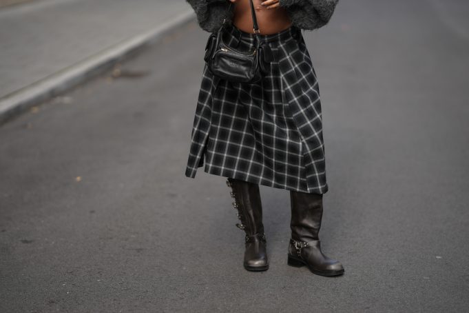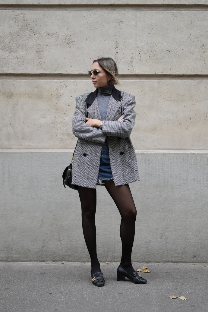 Οι μίνι denim φούστες δεν προορίζονται μόνο για το καλοκαίρι. Τώρα το φθινόπωρο (και μετέπειτα τον χειμώνα) θα την φορέσεις με ένα λεπτό μαύρο καλσόν, θα προσθέσεις ένα γκρι ή μαύρο τοπ και θα ολοκληρώσεις το σύνολο με ένα ζευγάρι μοκασίνια (φλατ ή με τακούνι). Το καρό σακάκι απαραίτητο.