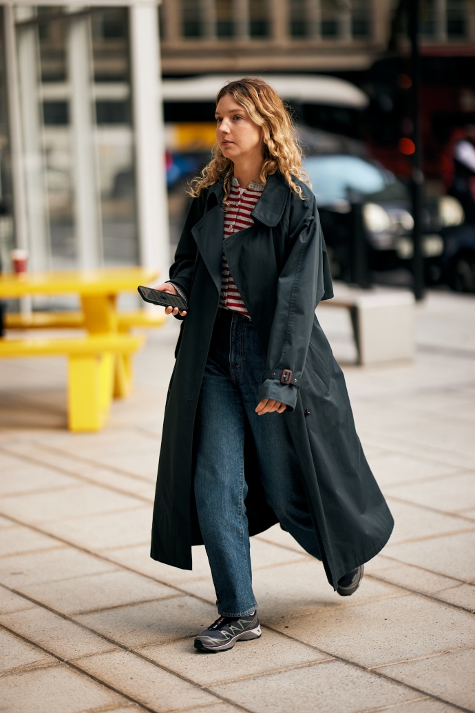 Ζακέτα μαρινιέρα με τζιν, sneakers και μάξι καμπαρντίνα